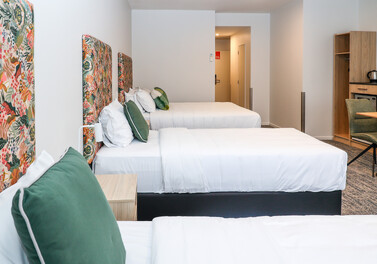 Experience exclusive, quality Wellington accommodation in our spacious ground floor studio room, featuring one Queen Bed, two Long Single Beds, and a sleek armless couch—designed for comfort, flexibility, and luxurious relaxation. Ideal for families or groups of up to four, this lush studio offers premium linens on every bed to ensure a restful night’s sleep. This Wellington hotel room showcases a contemporary standard with amenities including a flat-screen TV, free Wi-Fi, mini-fridge, microwave, and tea/coffee making facilities. The en-suite bathroom features a shower over a spa bath and complimentary toiletries, adding a soothing touch after a long day or flight. Whether you're visiting for business, leisure, or in transit, this room is perfect for those seeking stylish, high-quality accommodation in Wellington.